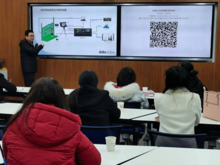 首先技术员从全自动录播室的功能、使用、操作步骤、注意事项等几方面进行了讲解,然后带领现场参加的教师进行实际使用体验。